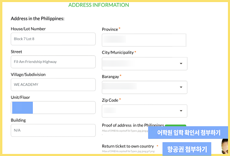 필리핀 어학원 입학 확인서를 첨부해 주시고,