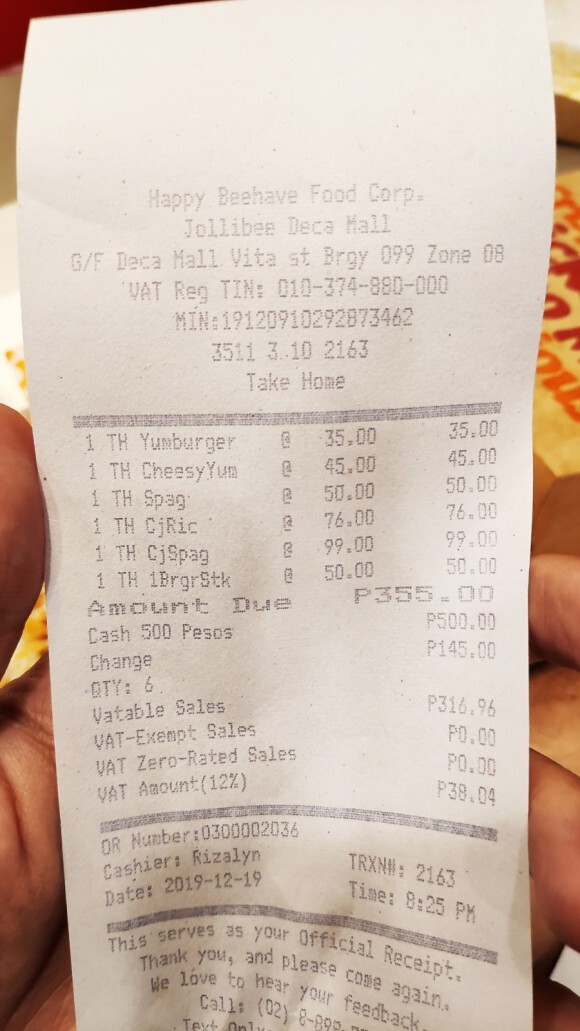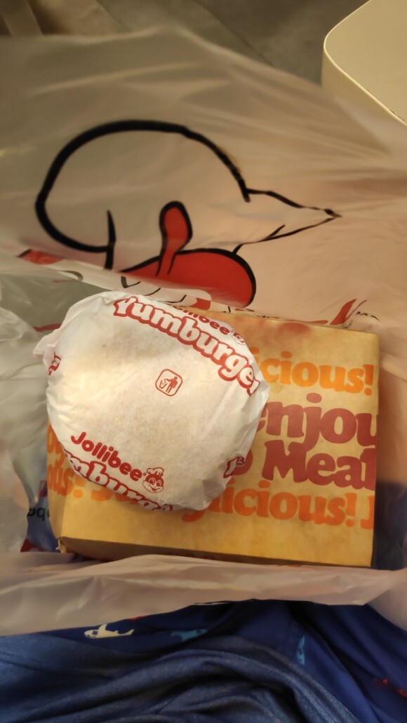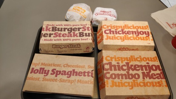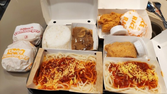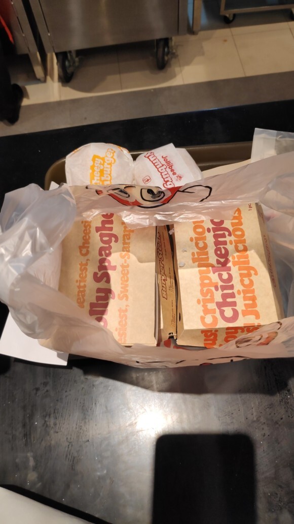 한참 기다려서 주문을 완료하고 드디어 포장된 졸리비 음식을 받았습니다