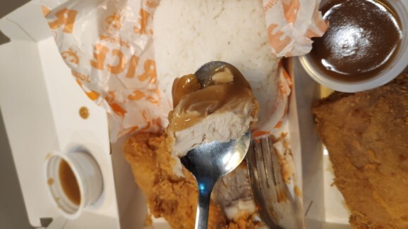 치킨 1조각 with 라이스 ('치킨조이' 라고 부름). 76페소