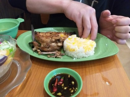 필리핀 사람들이 맨손으로 먹는걸 좋아해서 저도 도전... 밥 위에 노란 소스는 치킨오일입니다.