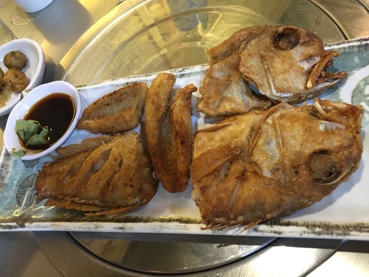 사실 옥돔구이는 평평한 프라이팬에 굽는게 일반적인데요. 필리핀에서는 웍(Wok;밑이 둥근 프라이팬)에 튀기는 경향이 많습니다. 필리핀 스타일이죠. 튀기다 보니 겉이 딱딱한 경우가 많구요.