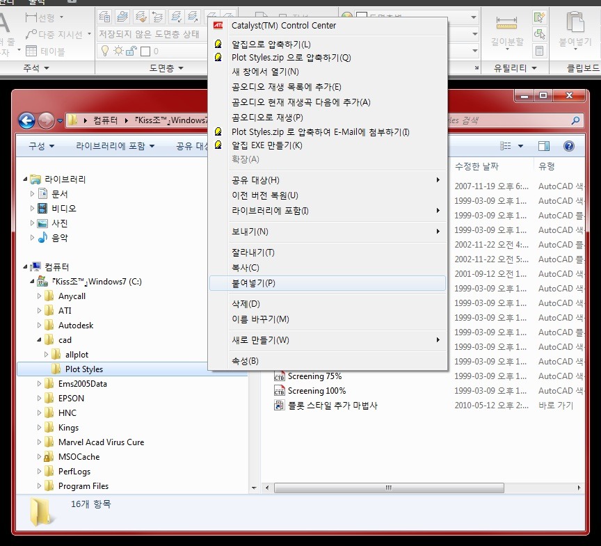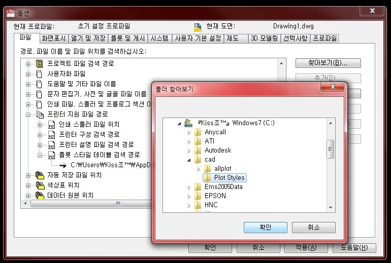 ( ^ ^)/ 창문7 64비트 오토캐드 2010 한글 64비트 '명령: _allplot_dcl ; 오류' 플롯 스타일 경로 재설정!으로 해결!!!