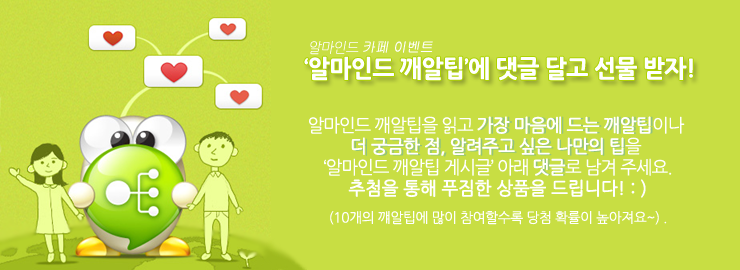 알마인드 카페 깨알팁 댓글 이벤트에 참여하셔서 알마인드 사용법도 익히고, 맛있는 선물도 받아가세요!