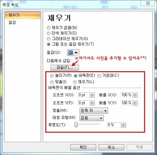 늘이기 / 바둑판 / 가운데 / 맞춤 / 채우기 옵션을 설정하고 사진의 배열이나 투명도도 설정할 수 있어요.