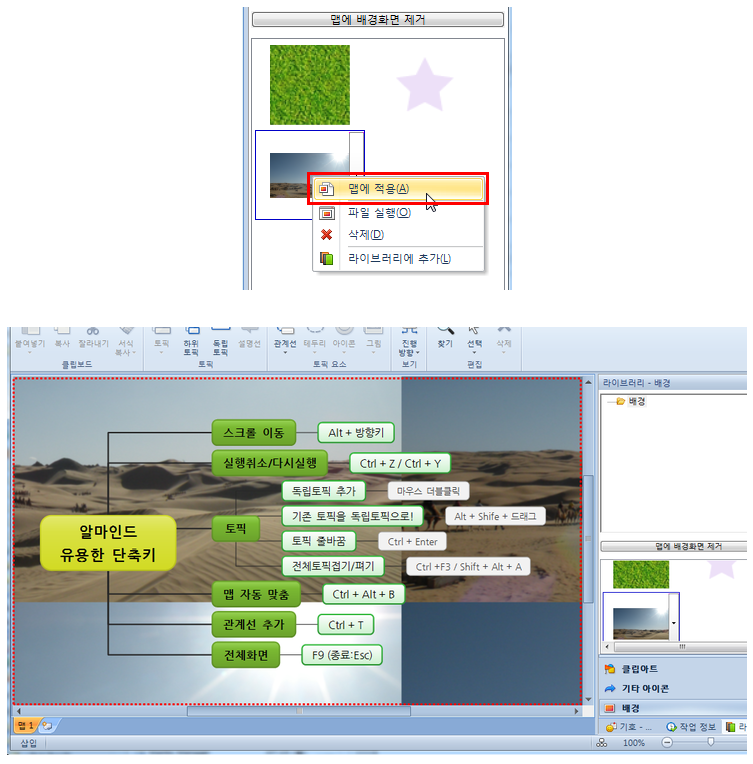 '맵 적용하기' 메뉴를 클릭하면 여러분이 만든 마인드맵 배경에 적용시킬 수 있답니다.^^