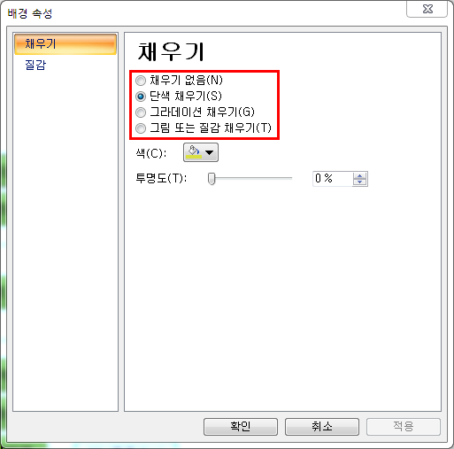 '단색 채우기', '그라데이션 채우기', '그림 또는 질감 채우기'를 이용해서 배경을 꾸밀 수 있어요.^0^