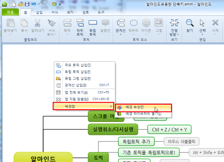 마인드 맵 배경에서 마우스 오른쪽 버튼을 클릭한 후, [배경]-[배경 속성]을 클릭해 주세요~^^