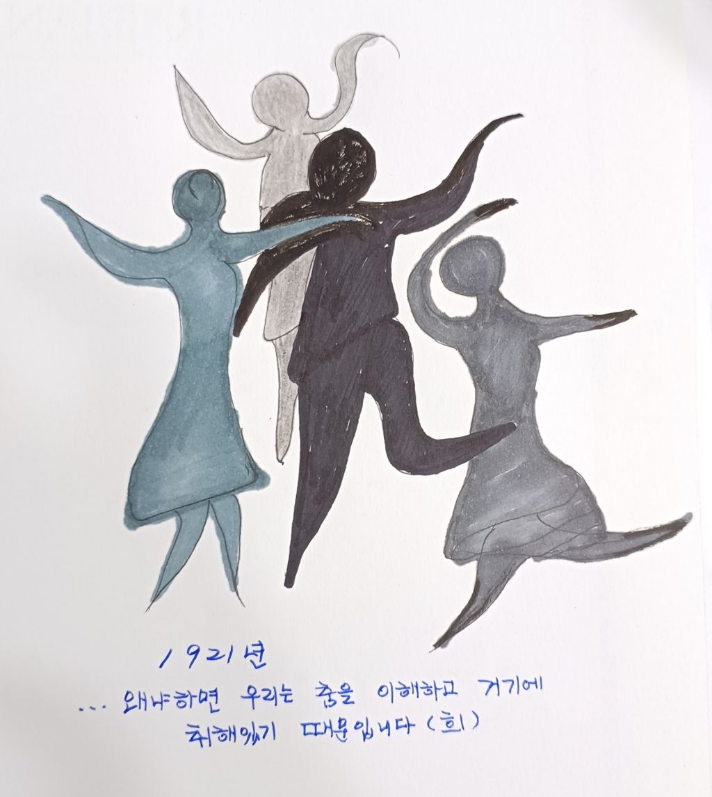 - 우리가 춤추는 것은 순전히 즐기기 위해서 입니다. 심지어 우리는 부엌에서 축음기의 음악에 맞추어 춤을 추기도 한답니다. 왜냐하면 우리는 춤을 이해하고 거기에 취해있기 때문입니다. 온몸으로 말이지요.뱃속은 물론 어깨, 그리고 심지어는 두 귀까지 말입니다.(희)