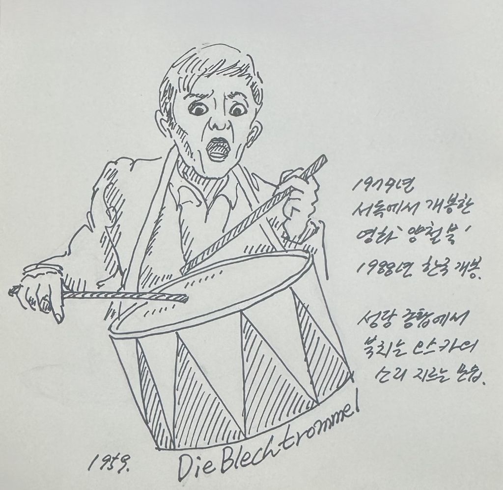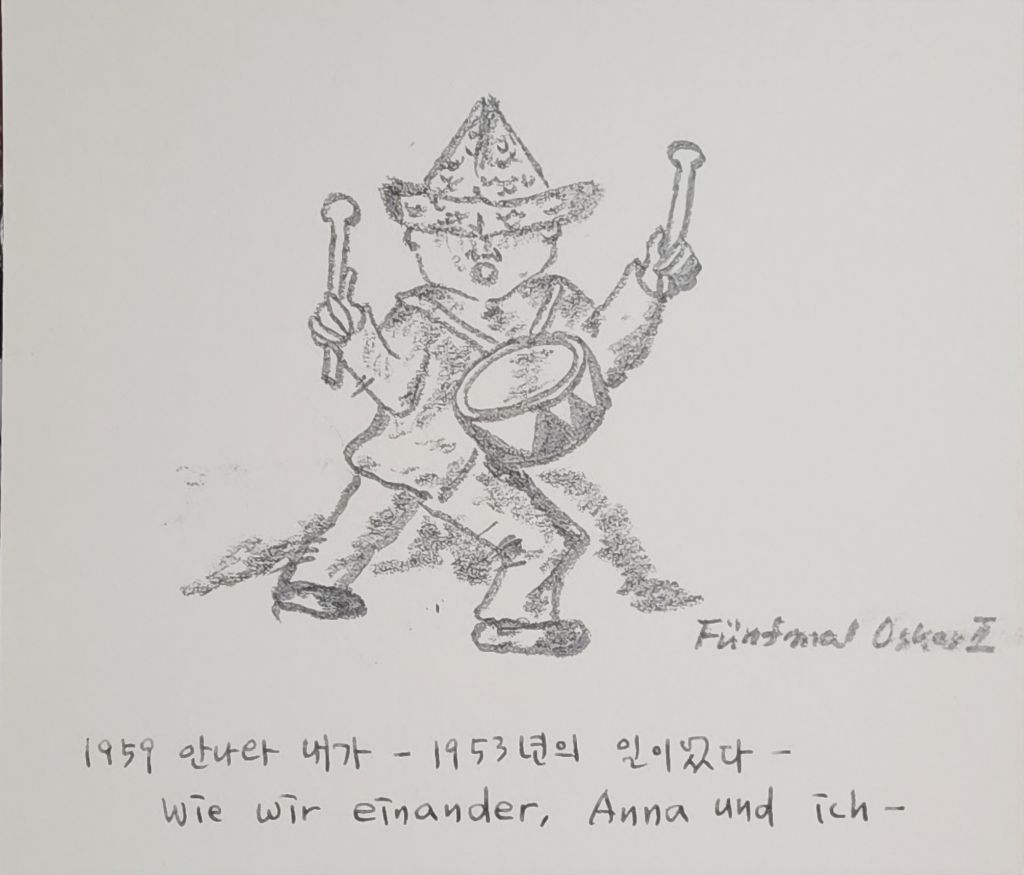 - 안나는 내가 이 소설을 쓰는 동안 파리 클리쉬 광장 주변에 있는 마담 노라한테 가서 매일같이 발레의 바를 잡고 비지땀을 흘렸다. 마침내 나는 마지막 쪽까지 타이프를 끝내고 루흐터한트 출판사가 있는 노이비트로 교정쇄를 보냈다. 책의 표지도 다 그려져서 오스카의 두 눈이 파랗게 칠해져 있었다.: 책보다 먼저 TV를 통해 알게 된 영화 <양철북>, 오래전에 봤음에도 주인공 오스카의 얼굴이 강렬한 이미지로 남아 잊히지 않는다. (공)