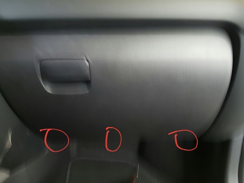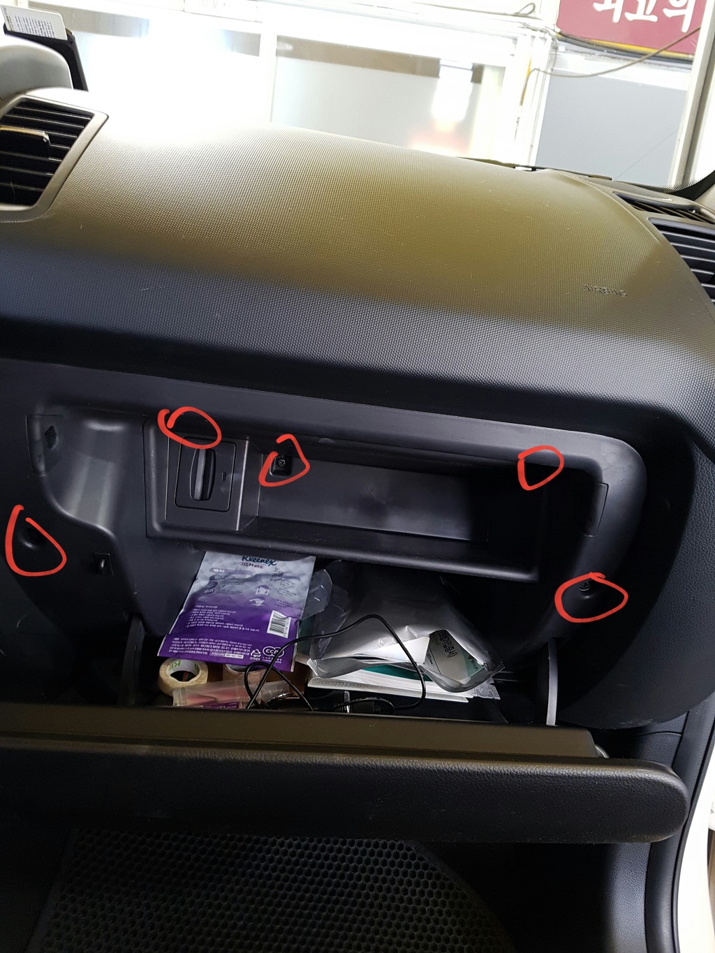 우선 글러브박스를 열고 동그라미 부분에 십자 나사를 풀러냅니다