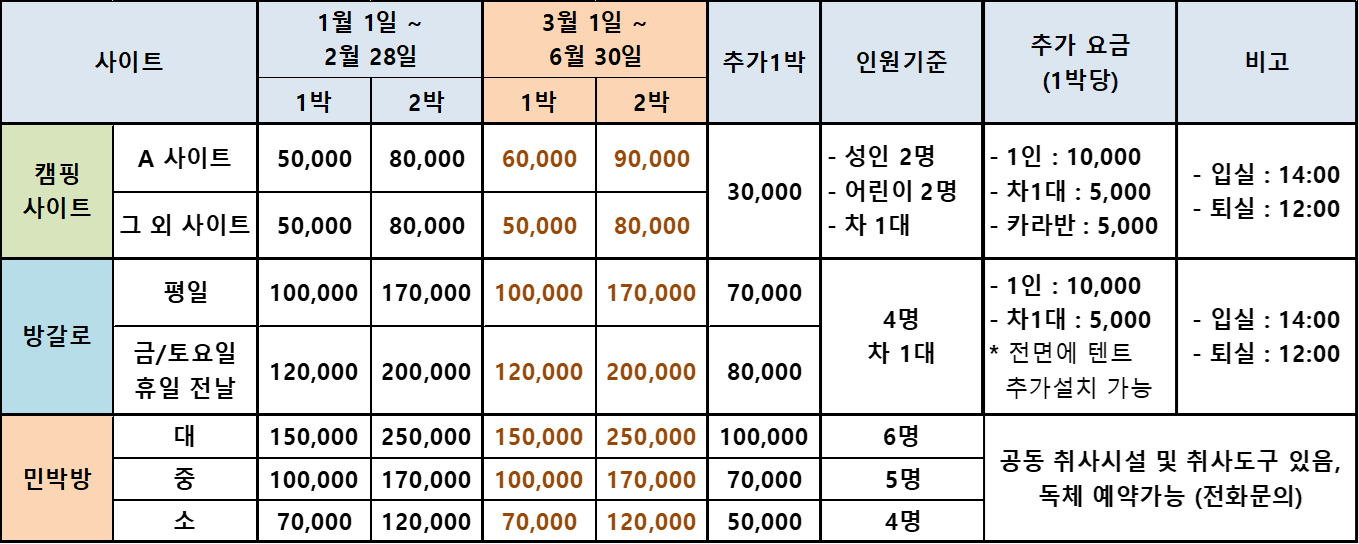 ☞ 3월~6월 말까지 한 달 4주, 주말 금/토 2박3일 기준 A사이트 36만원, 그 외 사이트 32만원 입니다.