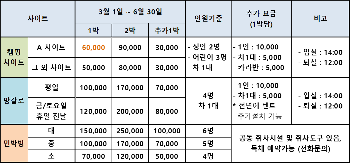 ※ 캠핑장 혼잡을 피하기 위해 인원/차량 추가는 금지합니다. 만일 인원이 추가될 경우 사전 신고바랍니다.