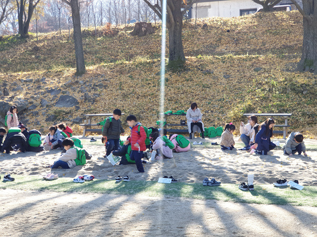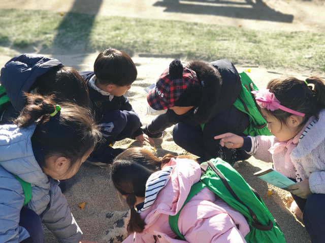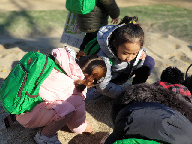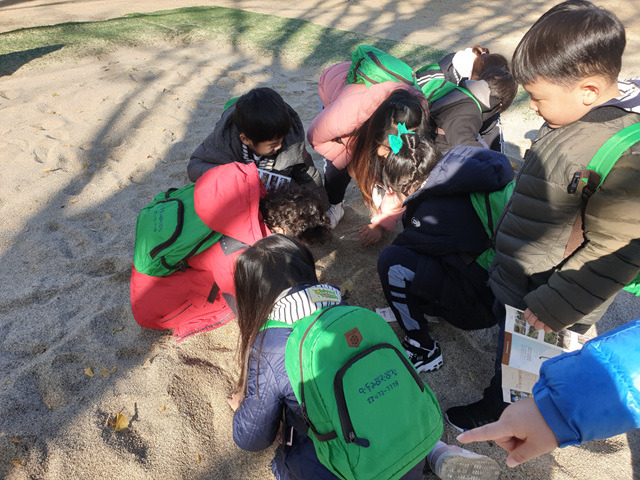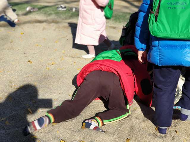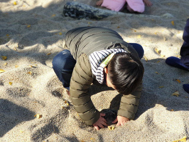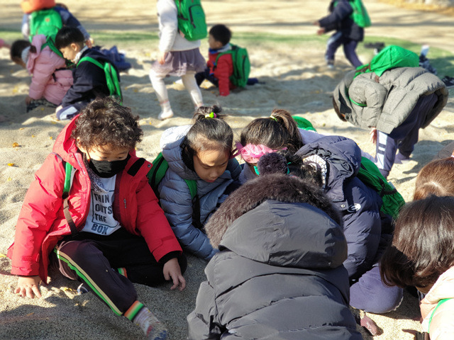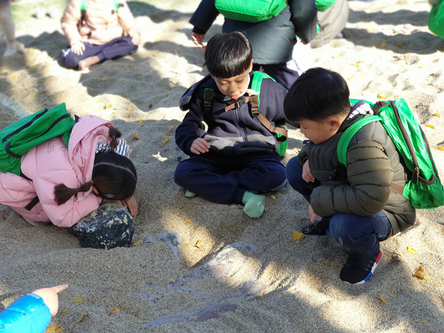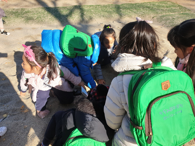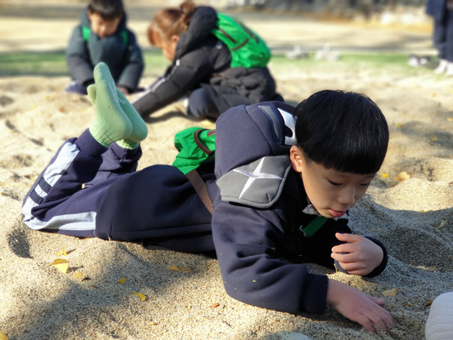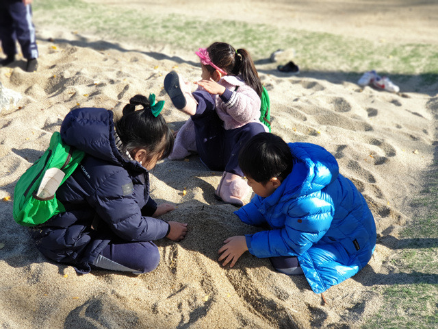 아이들은 모래에 코를 박고 무엇을 하고 있을까요?
