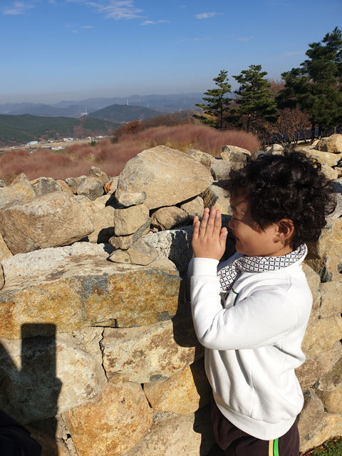 돌탑을 쌓아 소원을 빌어보는 우진이!