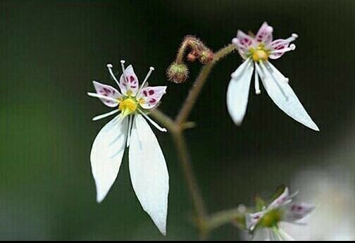 꽃잎은 다섯 장인데, 윗 세 장에는 짙은 붉은색 점이 있고,아래에 달린 두 장의 꽃잎은 흰색이고 바소꼴이며 길이 1~2cm 정도로 나란히 아래를 향합니다..