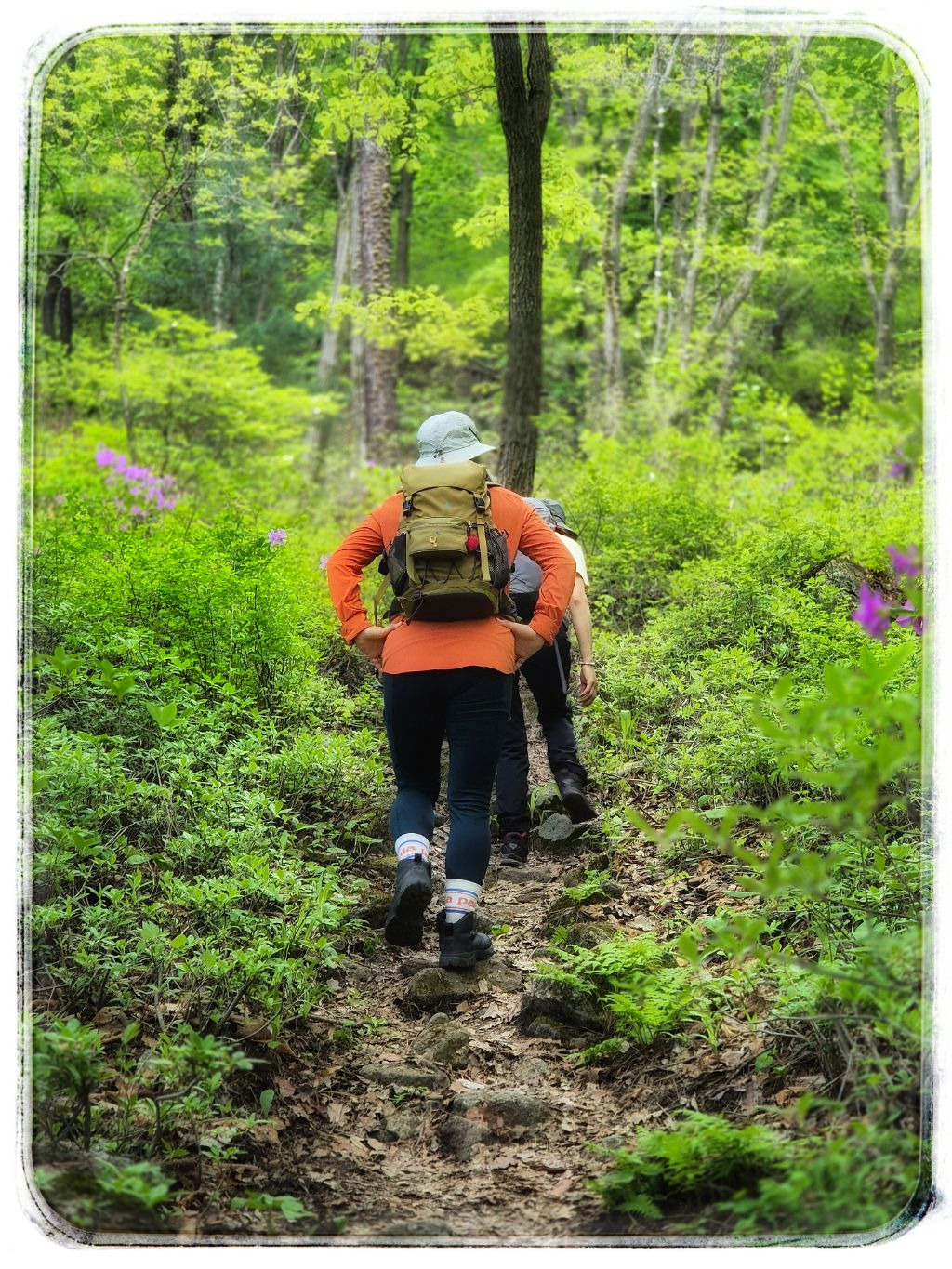 초록빛 숲길 사이로 분홍빛 철쭉이 어우러 져서