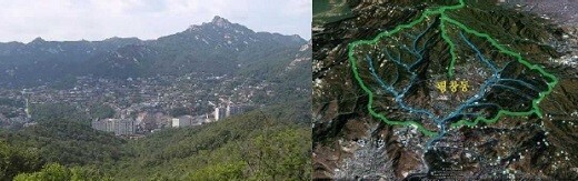 서울 평창동 일대 보국(오른쪽은 위성사진) 주변 산들로 둘러싸인 모습 / 자료제공=정경연 자연지리연구원 박사