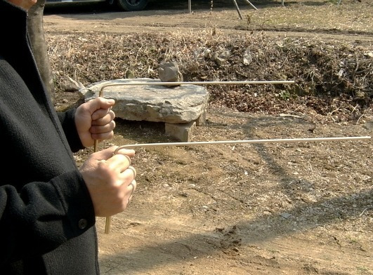 | 누구나 쉽게 수맥 탐사가 가능합니다. 수맥파가 몸에 해롭다는 것은 누구나 알고 있으나 지금 살고 있는 곳에 수맥이 있는지 알 수 없어 어렵게 생각하거나, 또는 어떻게 해야 하는지 방법을 몰라서 그냥 수맥 위에서 시달리고 있는 분이 많아서 피해 역시 너무 큽니다. 지금까지 수맥파에 시달리고 계시는 분들께 도움이 되고자 본인 스스로 간단히 수맥을 체크해 보고 수맥파로부터의 영향을 제로(0)상태 만들 수 있도록 도움을 드리고자 합니다. 순서대로 따라해 보시면 차원이 다른 어떠한 신기한 경험을 하게 될 것입니다. 수맥의 방향과 폭 탐사법 수맥의 방향을 잘 찾는 것이 수맥탐사의 핵심이라 할 수 있습니다. 왜냐하면 수맥도 작성의 기본이 되기 때문입니다. 잘 따라해 보시기 바랍니다. 방향과 폭을 알아 보는법 1. 수맥을 찾은 자리 위에서 엘로드를 반듯하게 세운다. 2. 주문을 외운다(수맥과 역방향이면 X자가 되어라) -역방향이 될려면 물이 나를 향에 오게 되고 내가 물을 가로 막았을때 엘로드가 X자가 된다. 즉 X자가 되었다는것은 물이 나를향해 와서 나의 등뒷쪽으로 흐르는 것이다. 3. 왼쪽이든 오른쪽이든 한방향으로 제자리에서 천천히 발을 옮겨본다. 4. 어느 한곳에서 엘로드가 X자가 되면 겹쳐진 상태에서 더 돌게 되면 반대쪽에서는 엘로드가 물의 흐름과 같아 펴지게 된다. 5. 방향을 잡았으면 앞뒤로 선을 긋고 선에서 왼쪽이든 오른쪽이든 한발짝 정도 떨어진 곳으로 몸을 이동하여 수맥을 바라본다. 6. 엘로드를 반듯하게 펴서 들고 왼발이나 오른발중 하나를 땅에 닿은 상태로 앞으로 이동하면 어느 순간에 엘로드가 겹치게 되고 나중에 알 수 있도록 그 지점을 표시한다. 7. 수맥의 반대편으로 이동하여 같은 방법으로 탐사하면 폭을 알 수 있다. |