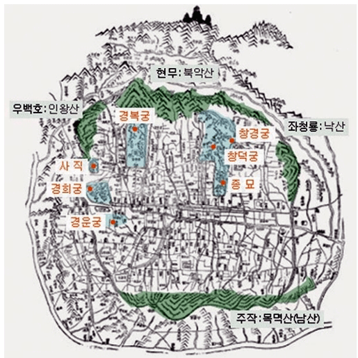 뒤로는 백악(북악산)이 우뚝하고 낙산과 인왕산을 좌청룡 우백호로 끼고 있으니까요.