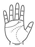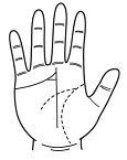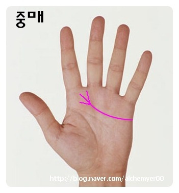 검지 손가락과 가운데 손가락 밑에서 가지가 크게 벌어진 선