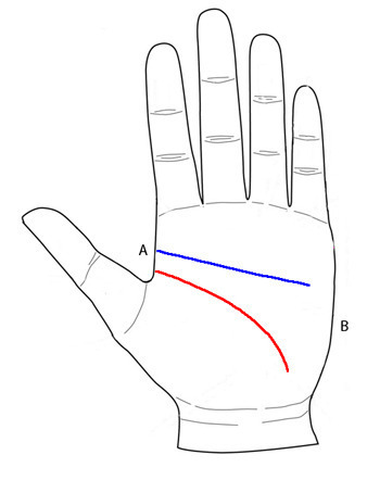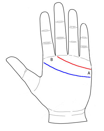 A쪽이 두뇌선의 시작점으로서, 시작점이 빨간선에 가까울수록