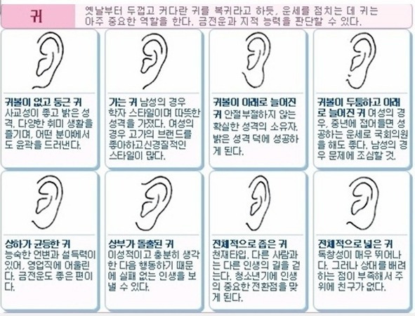 예전부터 귀가 크고 두툼한 사람은 복귀라고 하여 금전운과 지적능력이 뛰어나다고 판단할 수 있는 부분으로 알려져 있습니다.