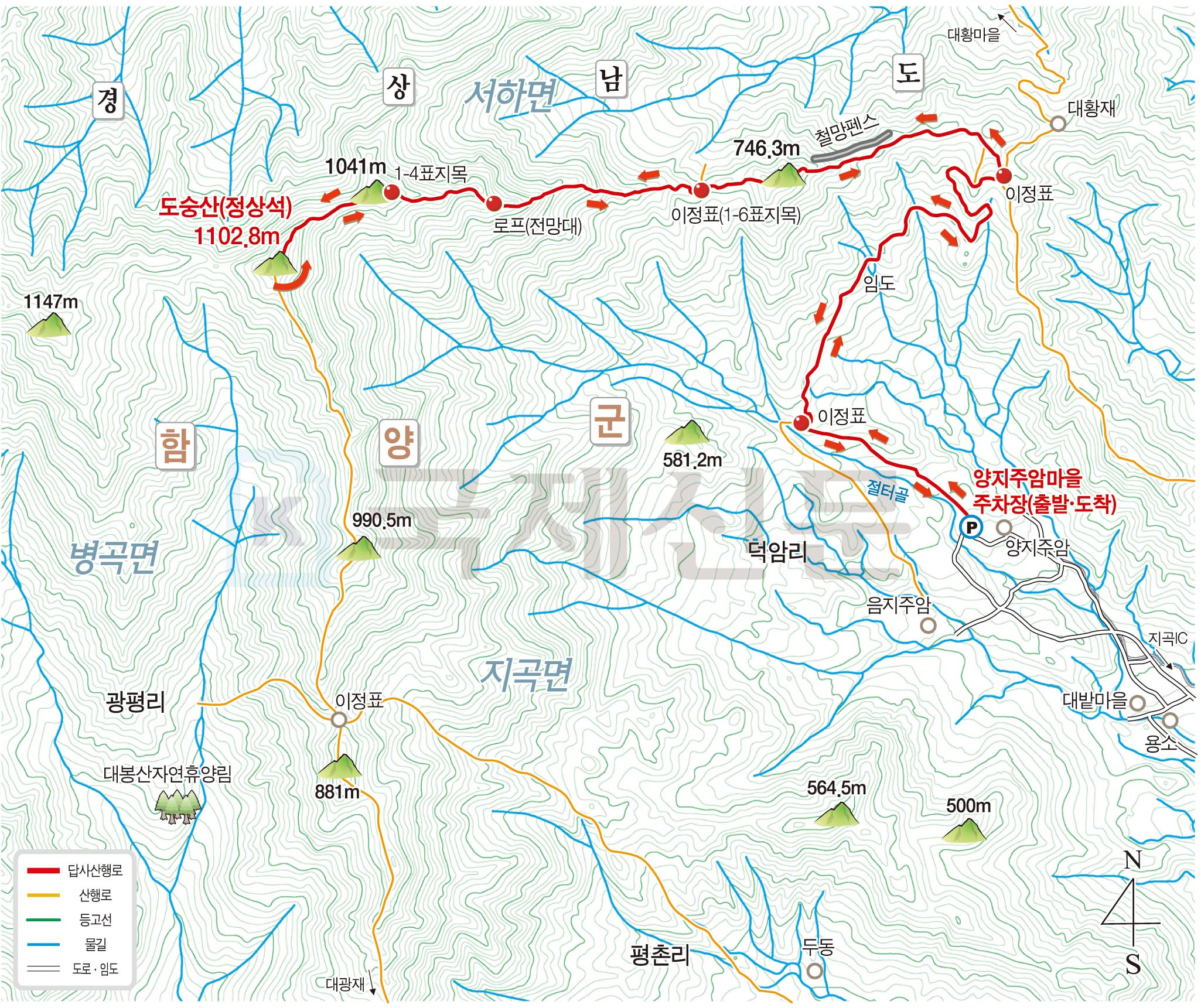 | 산행코스 | 코스 : ☞ 양지주암마을주차장~철망울타리~746.3봉~바윗길~1041봉~도숭산 원점회귀 |