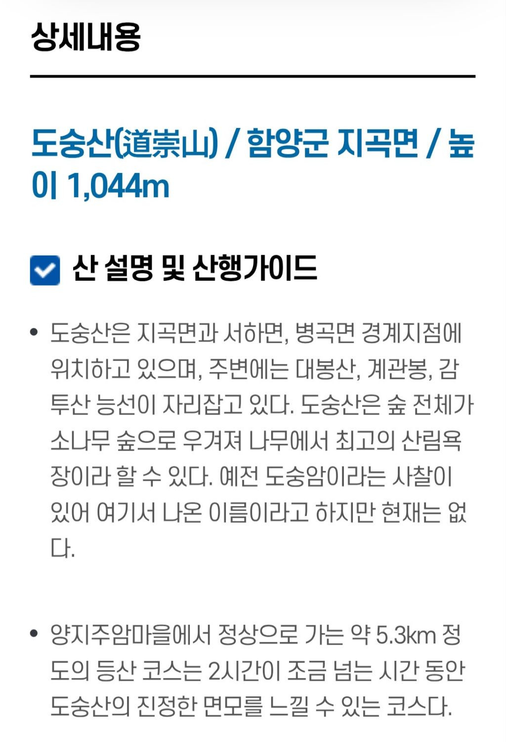 | 산행지설명 | ♠♠♠♠♠♠♠♠♠♠♠♠♠♠♠♠♠♠♠♠♠♠♠ 도숭산(道崇山) / 함양군 지곡면 / 높이 1,044m 도숭산은 지곡면과 서하면, 병곡면 경계지점에 위치하고 있으며, 주변에는 대봉산, 계관봉, 감투산 능선이 자리잡고 있다. 도숭산은 숲 전체가 소나무 숲으로 우겨져 나무에서 최고의 산림욕장이라 할 수 있다. 예전 도숭암이라는 사찰이 있어 여기서 나온 이름이라고 하지만 현재는 없다. 양지주암마을에서 정상으로 가는 약 5.3km 정도의 등산 코스는 2시간이 조금 넘는 시간 동안 도숭산의 진정한 면모를 느낄 수 있는 코스다. ♣♣♣♣♣♣♣♣♣♣♣♣♣♣♣♣♣♣♣♣♣♣♣♣♣♣♣♣♣♣♣♣♣♣♣♣♣♣♣ |