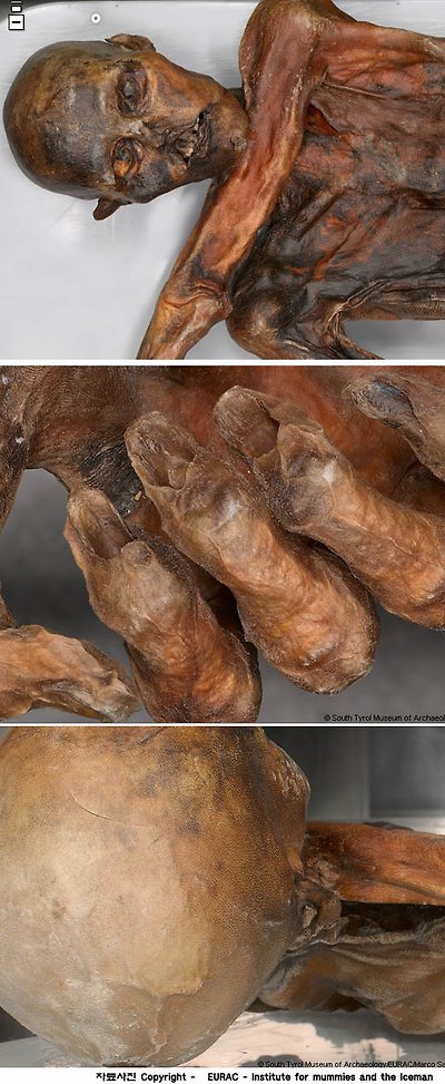 ▲ 석기시대의 전사로 추정되는 '아이스맨 외치'의 초고화질 사진 및 입체 사진이 인터넷을 통해 공개되었다. '외치'는 지난 1991년 해발 3,000m가 넘는 이탈리아 알프스 산맥의 눈 속에서 발견된 미라로, 과학자들의 연구 결과 약 5,300년 전 화살을 맞고 사망한 후 알프스의 눈 속에 묻혀 있었다.