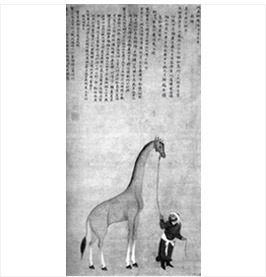 정화가 소말리아에서 가져온 '기린' 영락제는"성스러운 정치가 행해지면 기린이 나타난다"는 중국의전설을 염두에두고 이 신기한 짐승을 기린이라고 불렀다. | |