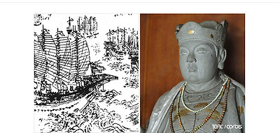 물결을 가르고 나아가는 정화의 함대(왼쪽), 말레이시아의 사당에 있는 정화의 석상