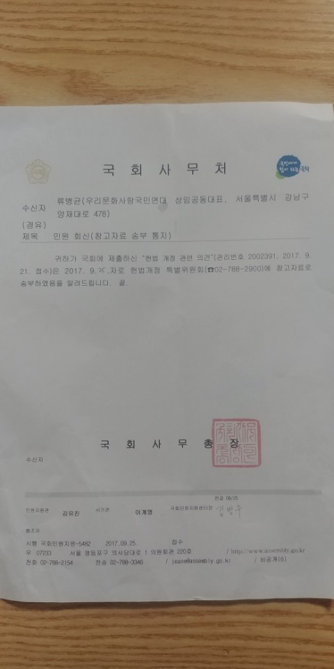 [행사후기]국회사무처에 접수한 개헌관련 청원서에 대한 민원회신 작성자까오리|작성시간17.10.16|조회수76 목록 댓글 0 글자크기 작게가 글자크기 크게가 지난 9월 국회사무처에 접수한 개헌관련 청원서에대한 민원회신이 도착했습니다. 다음검색 현재 게시글 추가 기능 열기 북마크 공유하기 신고 센터로 신고 댓글 댓글 0 댓글쓰기 답글쓰기 댓글 리스트