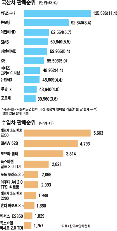 신형 YF쏘나타는 파격적 디자인으로 인기를 이어가고 있다. 인테리어도 역동적이면서 세련된 이미지를 담았다. 동력 성능도 뛰어나다. 6단 자동변속기에 165마력의 힘을 내는 엔진으로 주행 성능이 탁월하다. 최근에는 선택사양이던 사이드 에어백과 커튼 에어백을 기본 적용한 ‘안전성 강화 모델’을 내놓았다. 국내 최장수 모델인 데다 가장 높은 인지도와 중고차 시장에서의 경쟁력은 쏘나타를 선택하게 하는 힘이다.