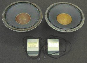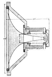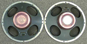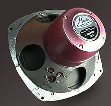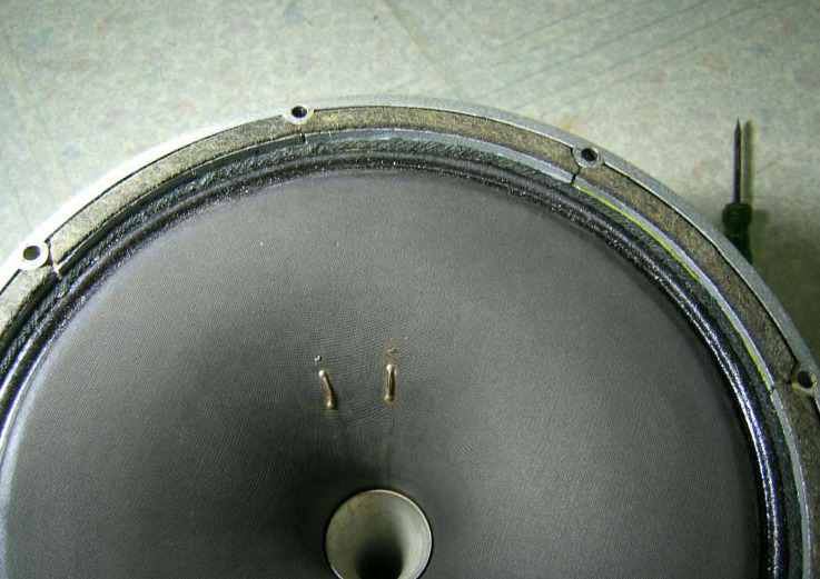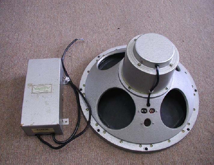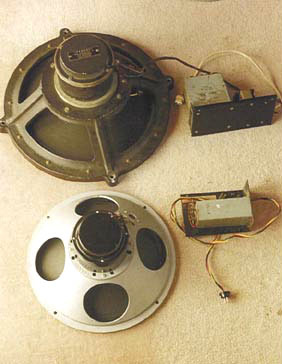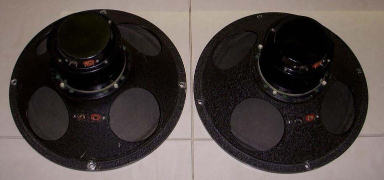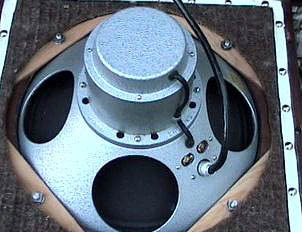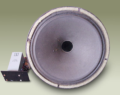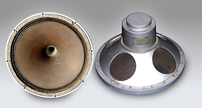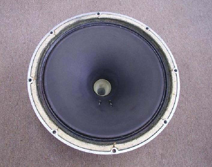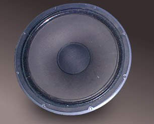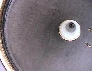Left: Front view of the low-frequency cone, showing the curve-linear shape. The dust cap is too dense to allow the high-frequency horn to be seen. Note the plasticized corrugated surround. The cone resonance is around 30Hz for this model which is higher than that acheived in the later HPD series.
