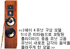 이 로서 우수한 사운드 이미징 을 가진 고음대역의 소리를 자연스럽게 드라이브 해 줄 수 있게 한 것인데 이를 실제적으로 보여 준 것이 모델 511에서 의 음향 기술이다. 특히 이 모델은 사용자가 원하는 콘넥팅 방식에 따라 싱글, 바이 와이어링, 또는 트리블등 다양하게 사용 할 수 있도록 설계 된 것과 4개의 다른 콘트롤 부를 갖진 유일한 크로스오버 시스템을 들 수 있다.