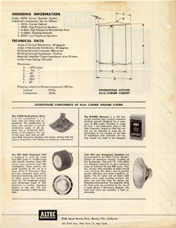 다만 A-7 모델만은 고음용에 1개의 804A와 저음용 803B 1개를 825 혼 드라이브에 부착 N800D 네트웨크를 사용하고 있다. 빅 보이스( BIG VOICE)란 타이틀을 갖고 거이 모든 PA 음향 사업에 도전하고 있는 알텍사로서는 이때가 전성기 였 는 데 미국 전역을 비롯해 물론 인근 캐나다에도 이 회사의 제품들이 사용될 정도로 절정기에 있었다. 이때 소개된 유닛을 잠시 살펴볼 것 같으면 저음용으로는 414A를 비롯해 515B, 803B,멀티형에 혼으로는 511A 와 811B 혼이 있고 디 플렉스 유닛으로는 601C를 비롯해 602C,605A 그리고 드라이브로서는 802D 와 804A 가 있었다.