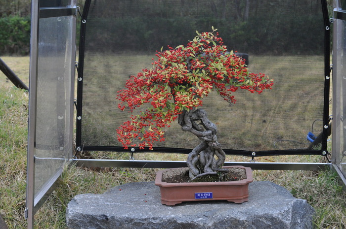 멕시코 원산의 피라칸사는 꺽꽂이도 잘 되는 유연한 가지와 아름다운 열매로 비교적 손쉬운 분재거리가 되어줍니다.