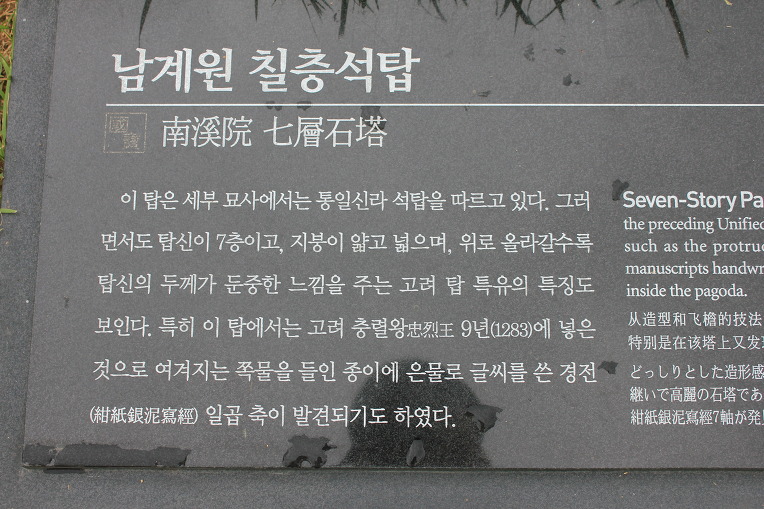 현재 이 탑의 기단부< 基壇部 >는 탑신< 塔身 >과 따로 떨어져 있어서 완전한 모습은 잃었다고 하겠다. 이 탑에서 은니사경< 銀泥寫經 > 7축< 七軸 >이 발견되어 국립중앙박물관< 國立中央博物館 >에 소장< 所藏 >되어 있는데 고려 충렬왕< 忠烈王 > 9년(1283)에 봉안< 奉安 >한 것으로 추정된다.