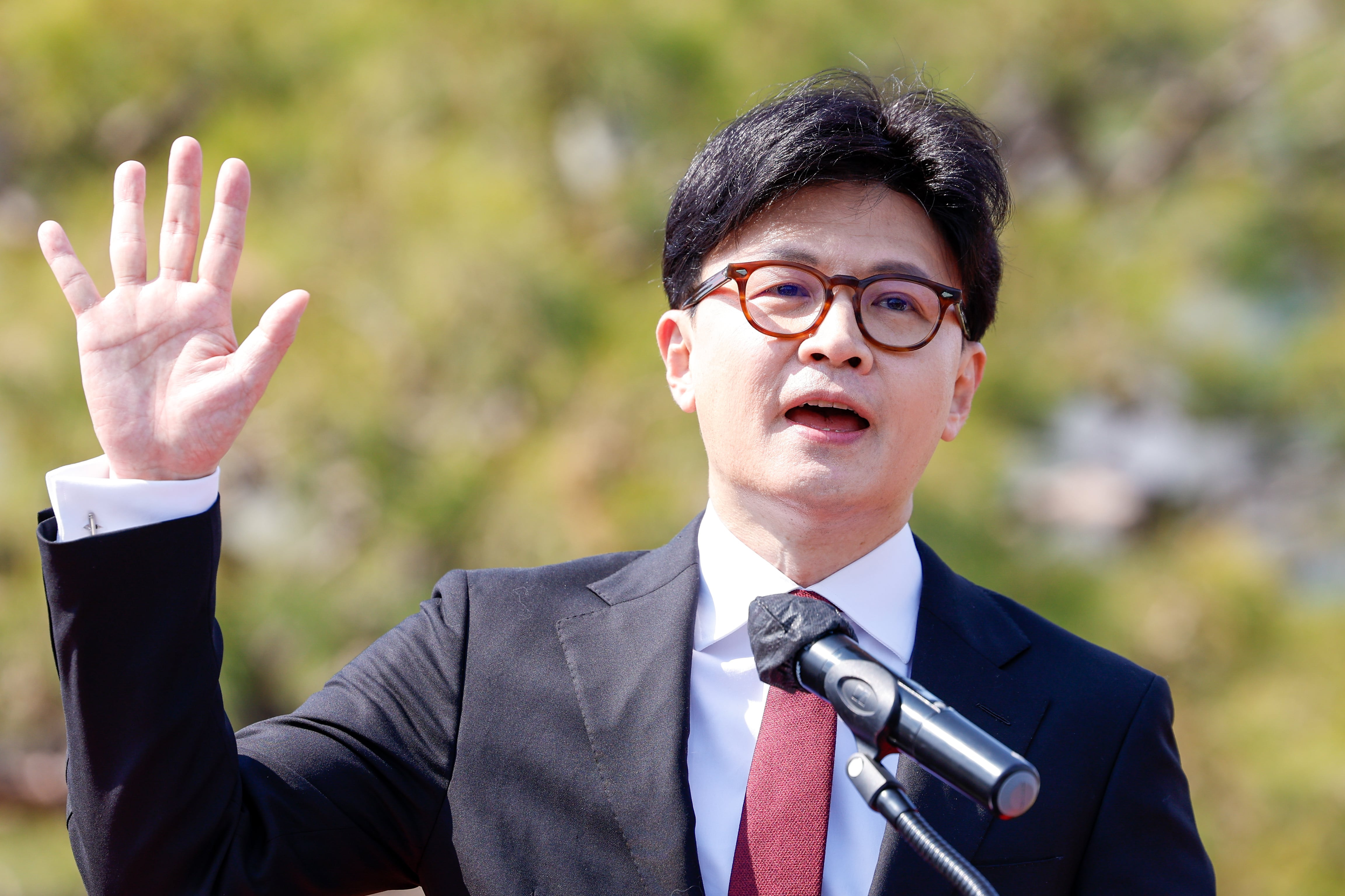 한동훈 국민의힘 전 대표가 지난 4월 서울 여의도 국회 분수대 앞에서 제21대 대통령 선거 출마를 선언하고 있는 모습./뉴스1