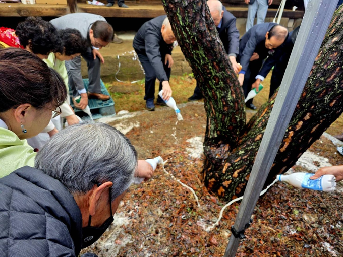 ▲ 현판 제막 후 소나무 앞으로 자리를 옮긴 종친들이 막걸리를 따르며 제례를 이어가고 있다. 김동현 기자 jhass80@kyongbuk.com