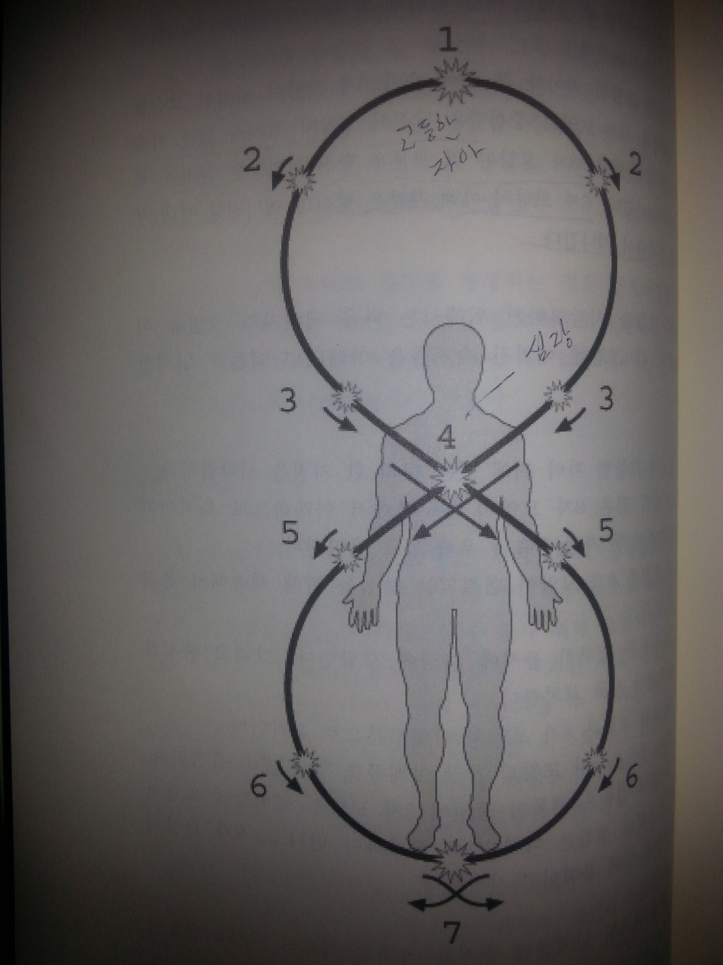 3 빛의 두 점들은 또한 당신의 에너지장 아랫부분에 저장되어 있는 부정적인 에너지를 끌어당긴다. 빛의 점들은 이 부정적인 에너지를 위에 있는 당신의 고등한 자아로 운반하는데, 그곳에서 부정적인 에너지는 영적인 불꽃이나 고등한 자아에 의해 소멸된다. 달리 말하면 당신은 이제 8자 모양의 흐름이 영적인 빛을 자신의 에너지장 속으로 가져오는 것과 불완전한 에너지를 당신의 영적인 자아로 끌어 올리는 것을 심상화하고 있다. 실제로 당신은 자신의 고등한 자아로부터 완전한 빛을 받고 있고, 동시에 불완전한 빛을 당신의 고등한 자아에게로 되돌려 보내고 있는 것이다. 그곳에서 그것들은 완전한 빛으로 다시 변형된다.