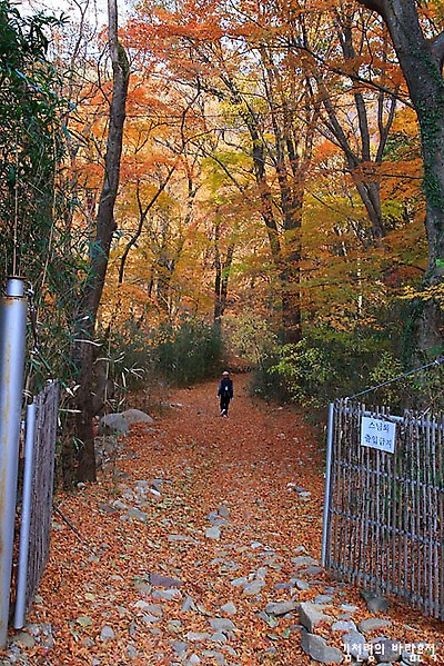 대밭을 지나면 산 중의 넓은 채마밭이 나온다. 채마밭에서 길은 두 갈래로 나뉘어진다. 왼편의 계곡길로 가면 굴목재(보리밥집) 방향이고, 채마밭을 돌아 똑바로 가면 천자암 가는 길이다. 그런데, 우리는 길을 잘못 들어 갈림길에서 왼편 계곡쪽을 택하였다. 나중에 안 사실이지만 이 잘못된 선택이 우리에게는 엄청난 복으로 돌아 왔다. 내려오는 길은 정상적으로 왔는데, 처음의 호젓한 오솔길을 빼고는 지루하기 짝이 없었다. 그에 비해 앞으로 글이 이어지겠지만 왼쪽의 계곡길은 두터운 낙엽과 단풍, 산죽, 맑은 계류, 전설과 함께 하는 내내 즐거운 산행길이었다. 소요 시간은 굴목재 방향이 30여 분이 더 걸렸다.