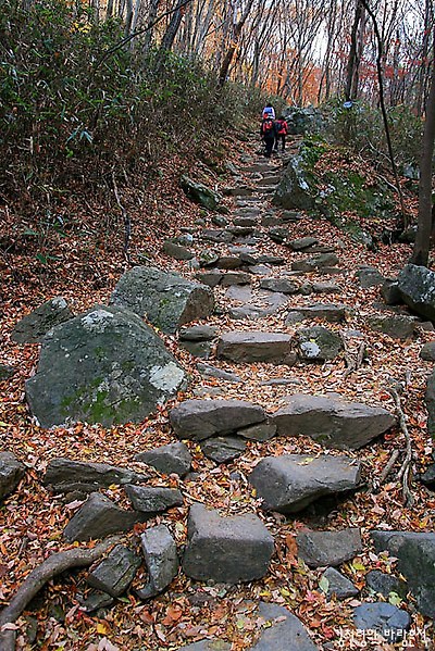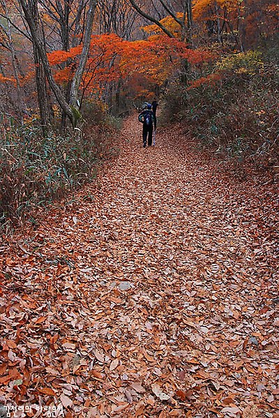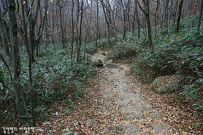 산길에 낙엽이 두툼하니 쌓여 있어 마치 붉은 융단 위를 걷는 듯 했다. 사각사각 낙엽 밟히는 소리에 발걸음마저 조심스러웠다. 김영동씨의 '산책'연주가 잘 어울리는 산행길이다.