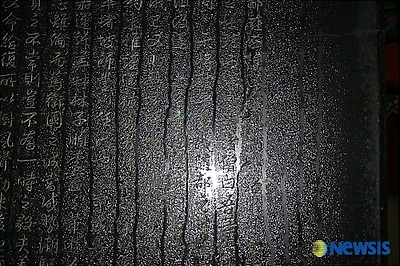 표충비는 1742년 임진왜란 때 의병을 일으켜 국난 극복에 앞장선 사명대사의 뜻을 기리기 위해 세워진 비석으로 사명대사비라고도 불린다. 올해 들어 표충비가 땀을 흘린 것은 이번이 처음이다. (사진=밀양시청 제공)/김해연기자