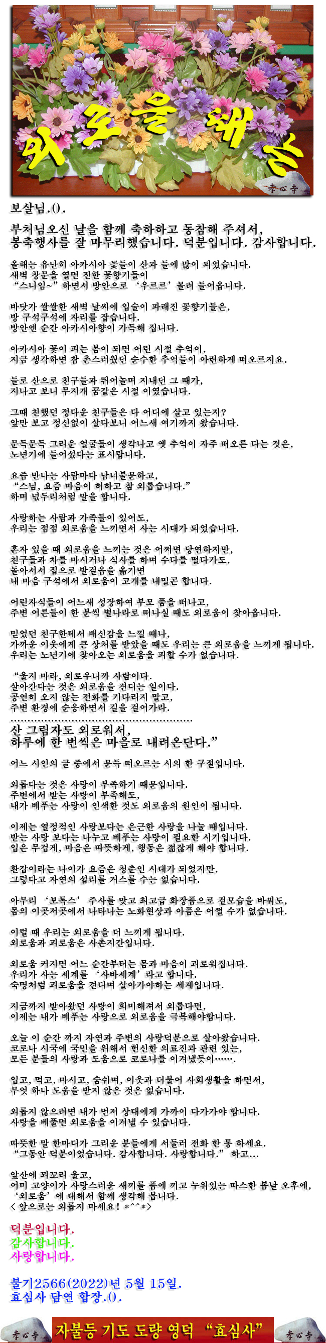 [스크랩] 외로울 때는...-효심사 담연 합장.(). 작성자연화 심|작성시간22.05.15|조회수203 목록 댓글 2 글자크기 작게가 글자크기 크게가 다음검색 스크랩 원문 : 효심사 현재 게시글 추가 기능 열기 북마크 공유하기 신고 센터로 신고 댓글 댓글 2 댓글쓰기 답글쓰기 댓글 리스트 작성자顥釋(호석) | 작성시간 22.05.15 감사합니다나무아미타불나무아미타불나무아미타불 작성자꿈속사랑 | 작성시간 22.05.16 감사합니다 고맙습니다나무아미타불 나무아미타불 나무아미타불 댓글 전체보기