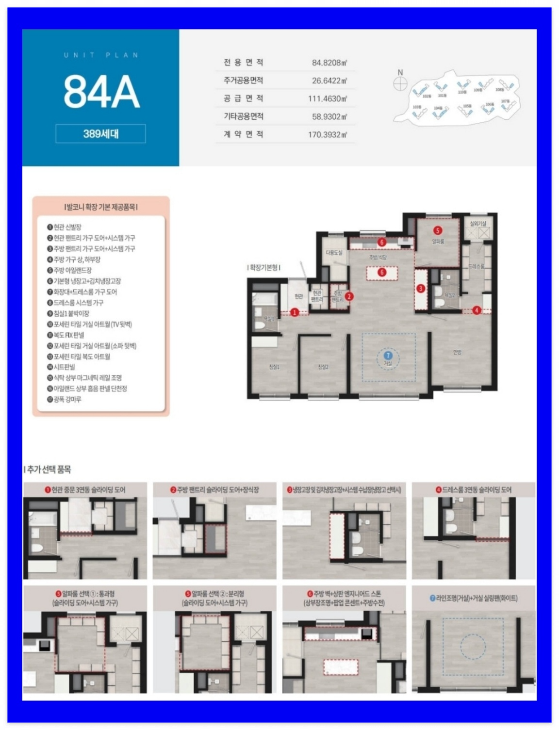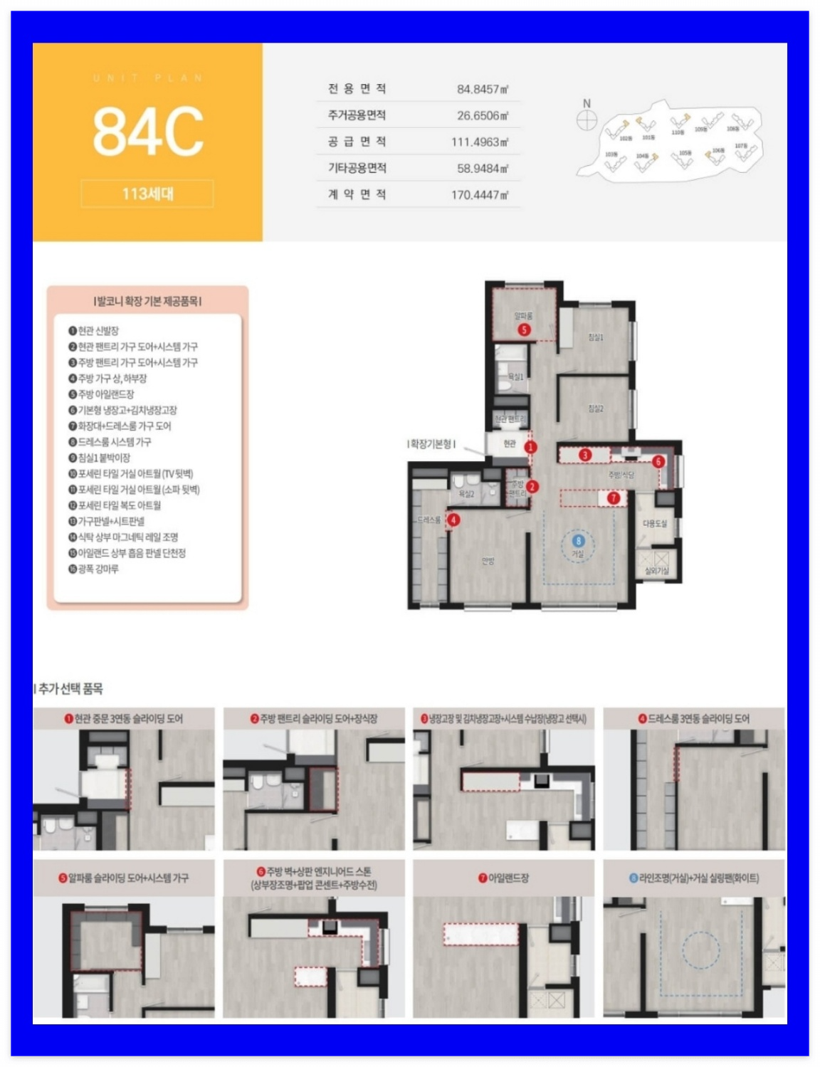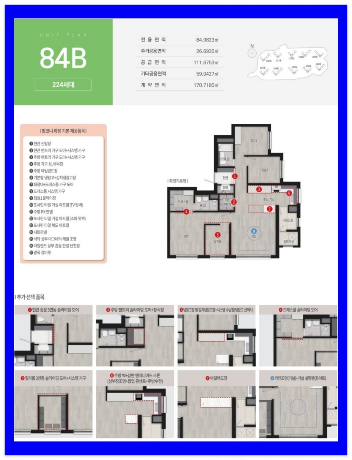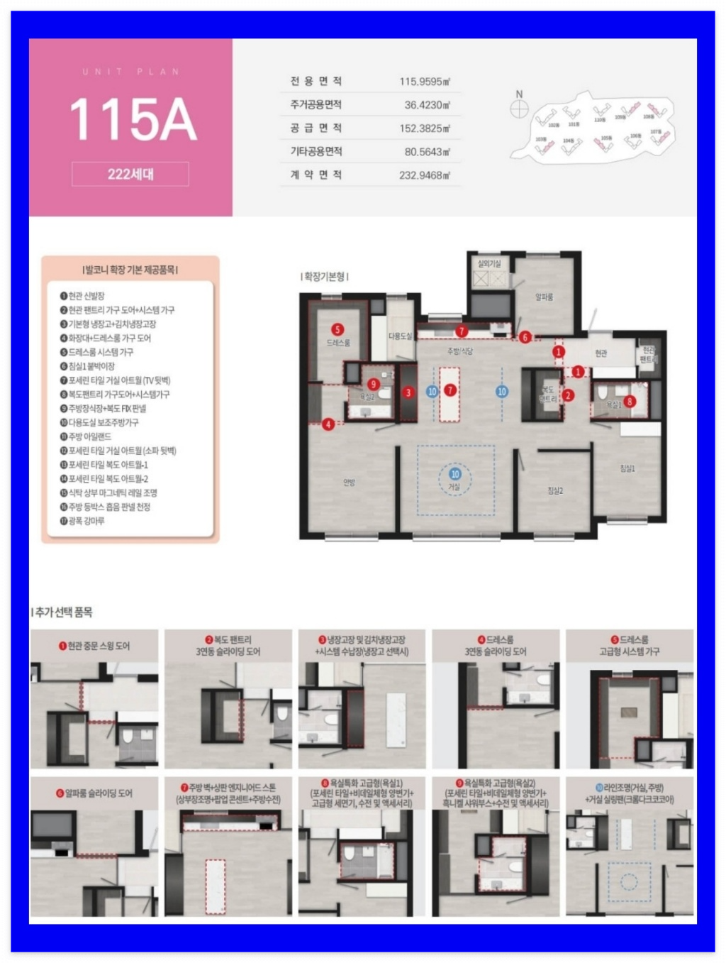 발코니 확장 선택 시 다수의 옵션이 무상으로 제공되며, 입주민의 라이프스타일에 따라 공간을 구성할 수 있도록 욕실특화(전용 115㎡ 타입) 등 추가 유상 옵션 선택 품목도 다양하게 구비됐습니다.