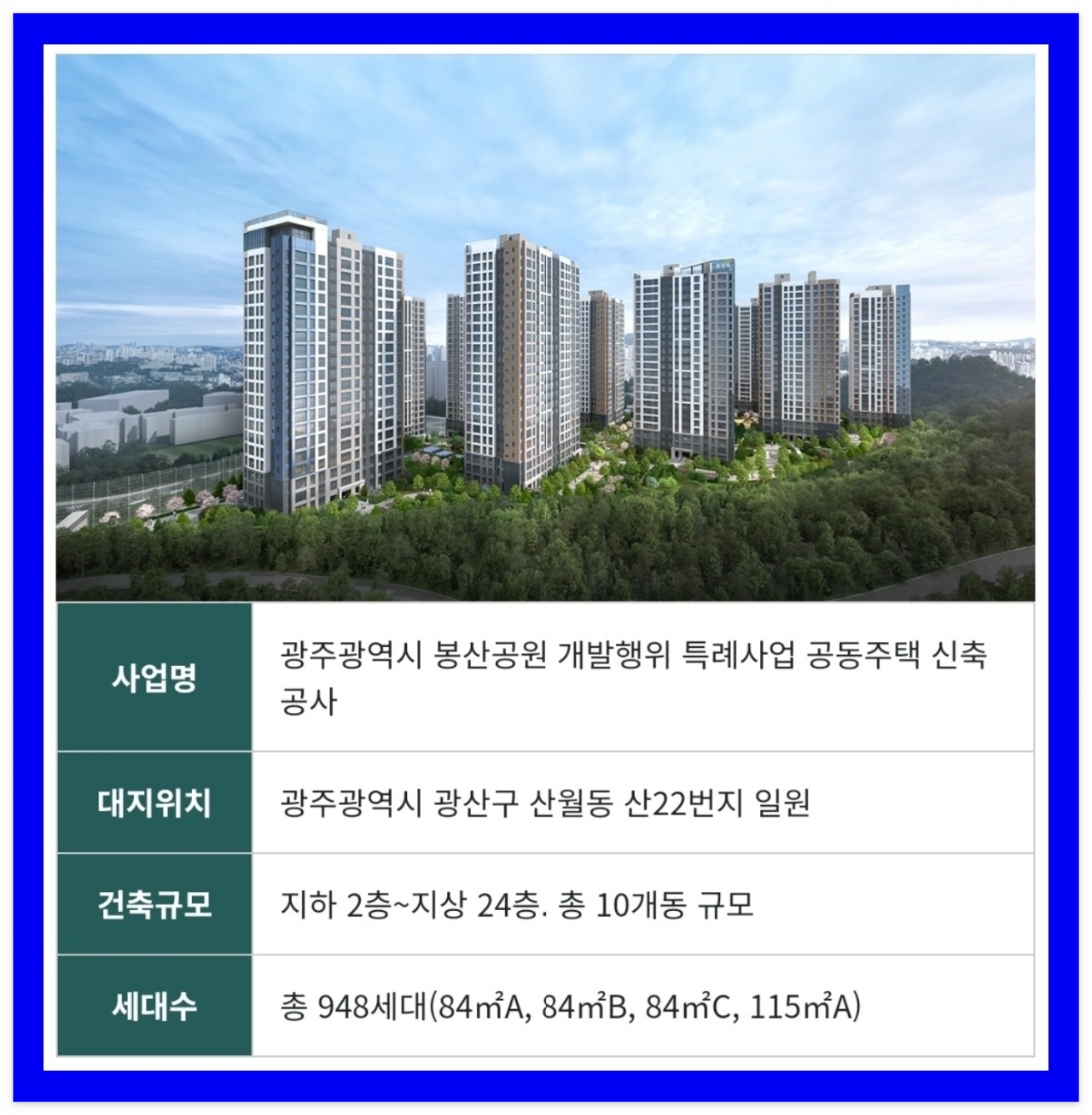 #봉산공원첨단제일풍경채 아파트는 광주광역시 광신구 산월동 산 22번지 첨단지구 일원에 민간공원 특례사업을 통해 신규 공급되며 단지는 지하 2층~지상 24층, 아파트 10개동, 전용면적 84~115㎡의 선호도가 높은 중대형 평형대로 구성, 총 948세대 규모의 대단지 브랜드 아파트로 조성됩니다.