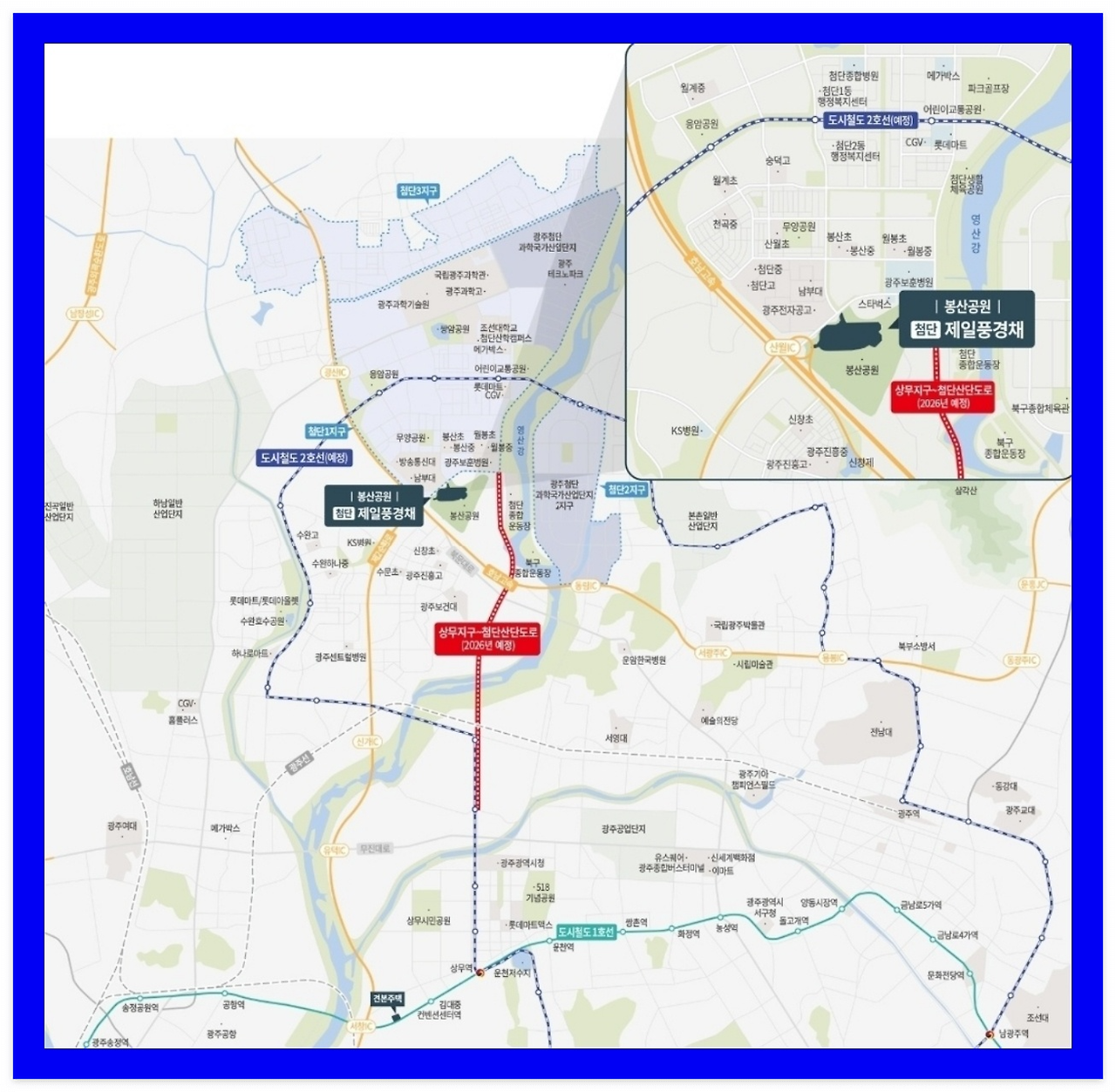 첨단 봉산공원 제일풍경채 단지는 산월IC가 바로 앞에 있어 호남고속도로를 통한 이동이 편리하며, 상무지구와 첨단지구를 잇는 신설도로가 2026년 개통 예정돼 있어 향후 교통 환경은 더욱 우수해질 전망입니다.