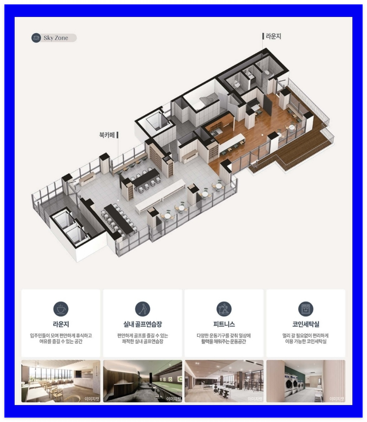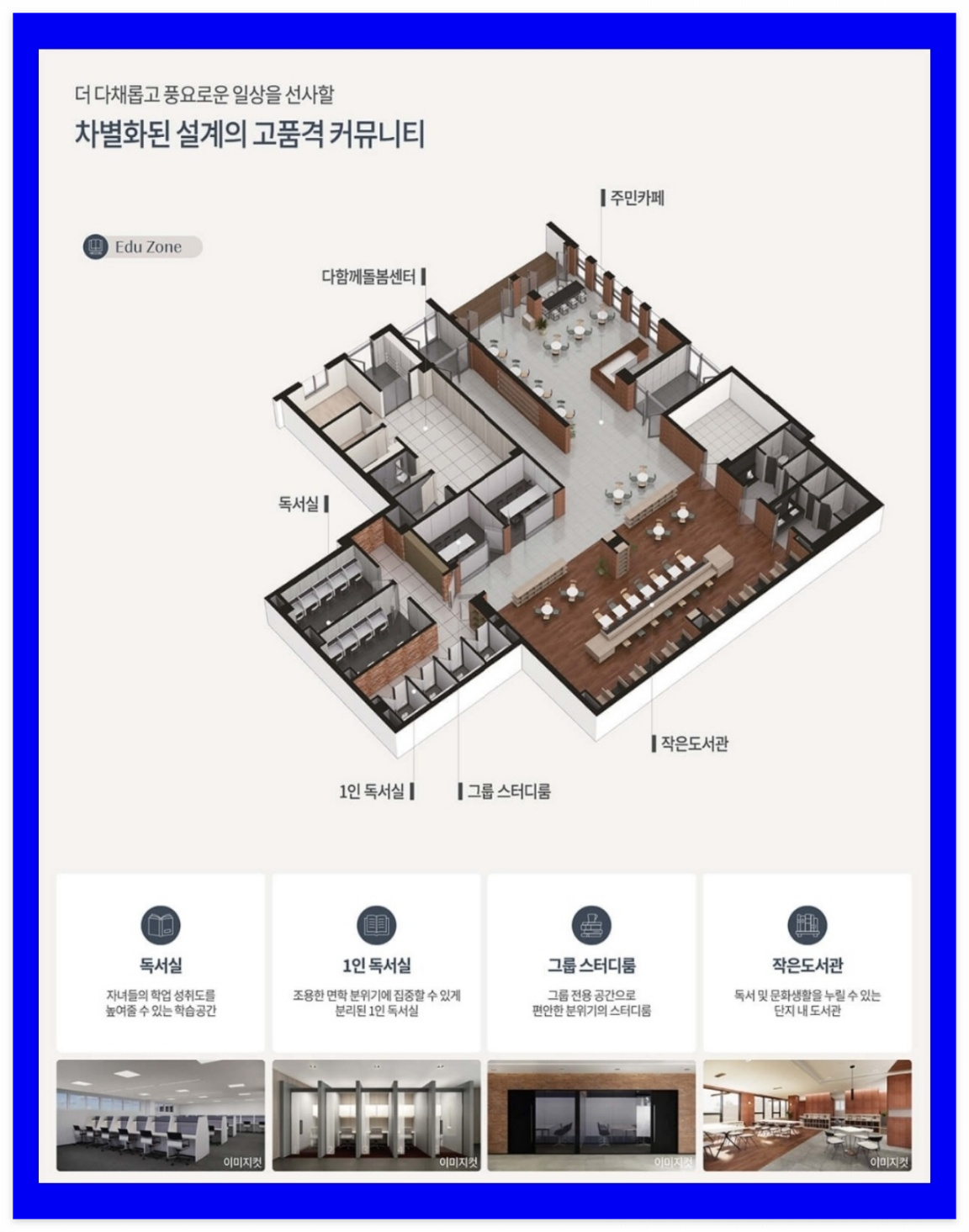 단지 내 입주민 편의시설로는 입주민의 건강을 고려한 피트니스센터 및 실내골프연습장 등의 운동시설을 비롯해 코인세탁실, 라운지, 주민카페, 다함께돌봄센터, 독서실, 작은 도서관, 1인 독서실, 그룹스터디룸, 경로당, 어린이집, 어린이 놀이터 등 다채로운 커뮤니티 시설이 계획돼 있습니다.