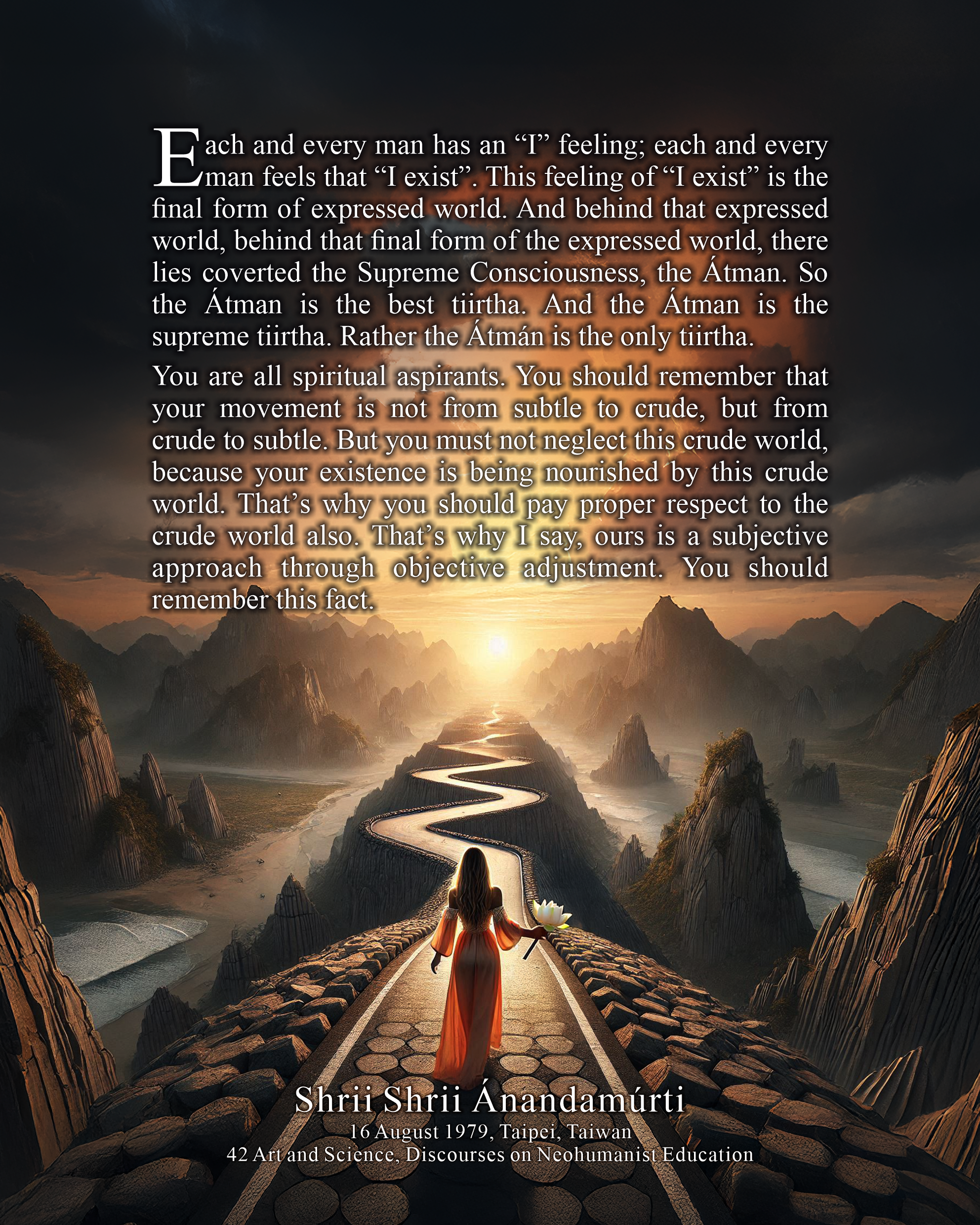 모든 인간은 “나는 존재한다”는 느낌을 가지고 있다. 이 “나는 존재한다”는 느낌은 발현된 세계의 최종 형태이다. 이 발현된 세계의 최종 형태 이면에는 숨겨진 지고의식, Átmá가 존재한다. 그러므로 átmá는 지고의 tiirtha(최고의 순례지)이다. 아니, Átmá는 지고의 Tiirtha, 아니 Átmá는 유일한 tiirtha이다. 너희들은 모두 영적 수행자들이다. 여러분의 진보는 정묘함에서 거칠음으로 가는 것이 아니라, 거칠음에서 정묘함으로 나아가는 것이다. 하지만 이 거친 세계를 소홀히 해서는 안 된다. 왜냐하면 너희들의 존재는 이 거친 세계에 의해 부양되고 있기 때문이다. 그래서 거친 세계에도 마땅한 존중을 표해야 한다. 그래서 나는 말한다: 우리의 길은, 객체적 적응을 통한 주체적 접근이다. 이 사실을 기억하라.